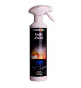 Motip Rain Away — высокотехнологичная полимерная композиция придает водоотталкивающие свойства и обеспечивает идеальную чистоту стеклам и зеркалам автомобиля. Вода и грязь под напором набегающего потока воздуха (на скорости выше 45 км/ч) скатываются, оставляя стекло прозрачным. В аварийном режиме позволяет ехать без дворников.